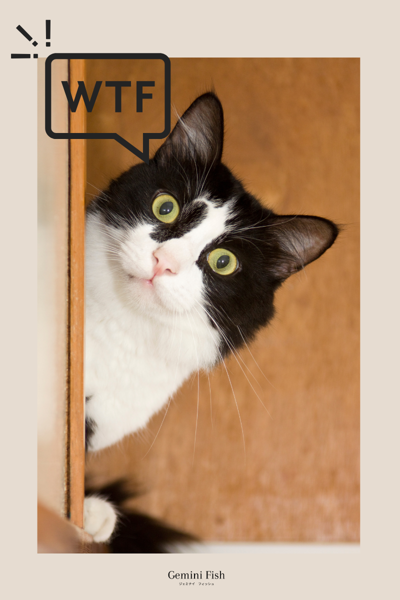 ちなみにかわいいネコちゃんが驚いている「WTF」は英語の「What the f○○○?」の略でネットスラングと言われるものです。お上品な言葉ではないのでご使用の際には十分にご注意ください。